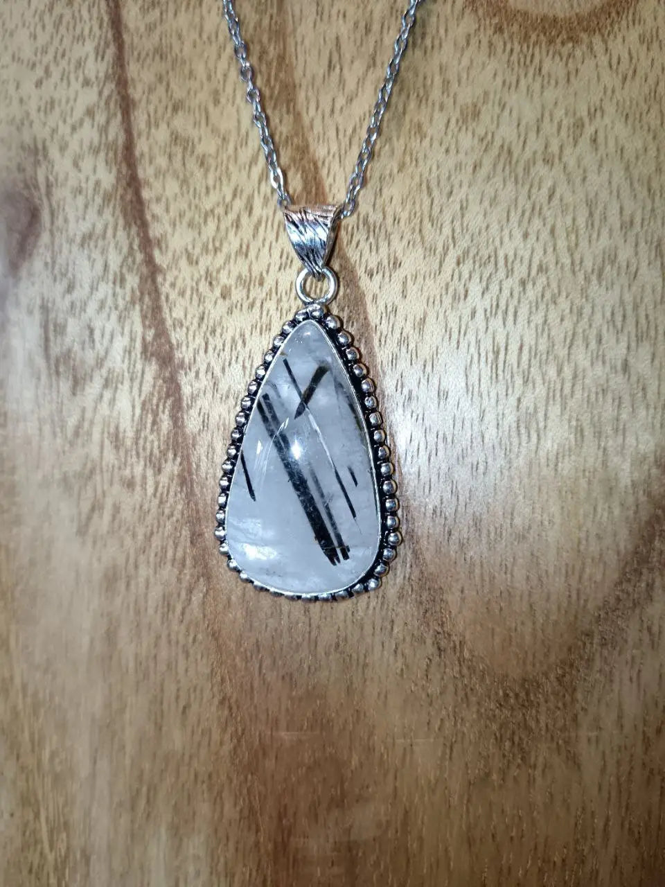Questa collana custodisce un Quarzo Tormalinato, una pietra in cui la luce del quarzo trasparente incontra le venature scure della tormalina, come radici che attraversano il cristallo.